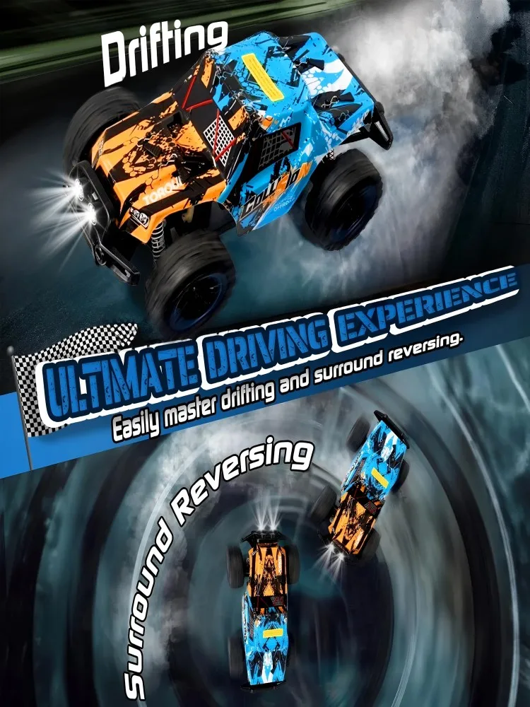 【Brushless motor for top to 26KM/H】This brushless RC monster truck is powered by a brushless motor, which hits a top speed of over 26KM/H. Its full metal drive train, reinforced with steel gears and pinions, ensures durability for high-speed off-road racing games. It is a deluxe fast RC cars for adults and practiced children over 8 years old.