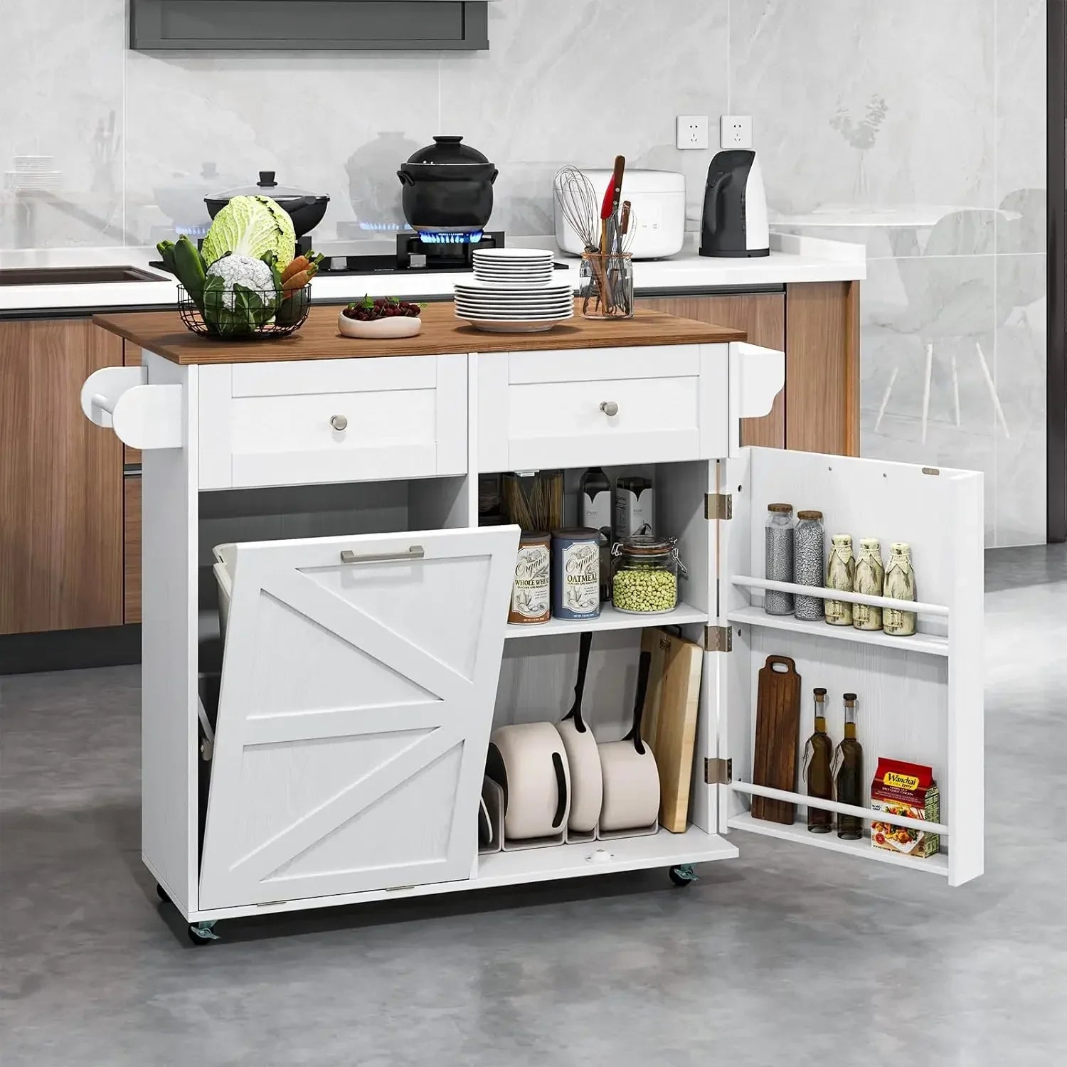 Rolling Kitchen Island with Trash Can Storage Cabinet, Drop Leaf Breakfast Bar Table, Towel Holder, 2 Drawers & Door Racks