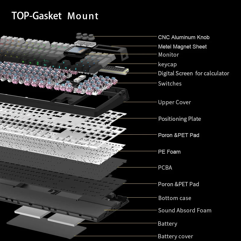 TOP-Gasket fixed connection, high-quality multi-layer built-in foam rubber, the top buffer is made of durable elastic material, tightly fits each key, forming a barrier between the keys and the keyboard base, reducing typing Noise and vibration, able to withstand intense typing and gaming, providing a comfortable typing experience.