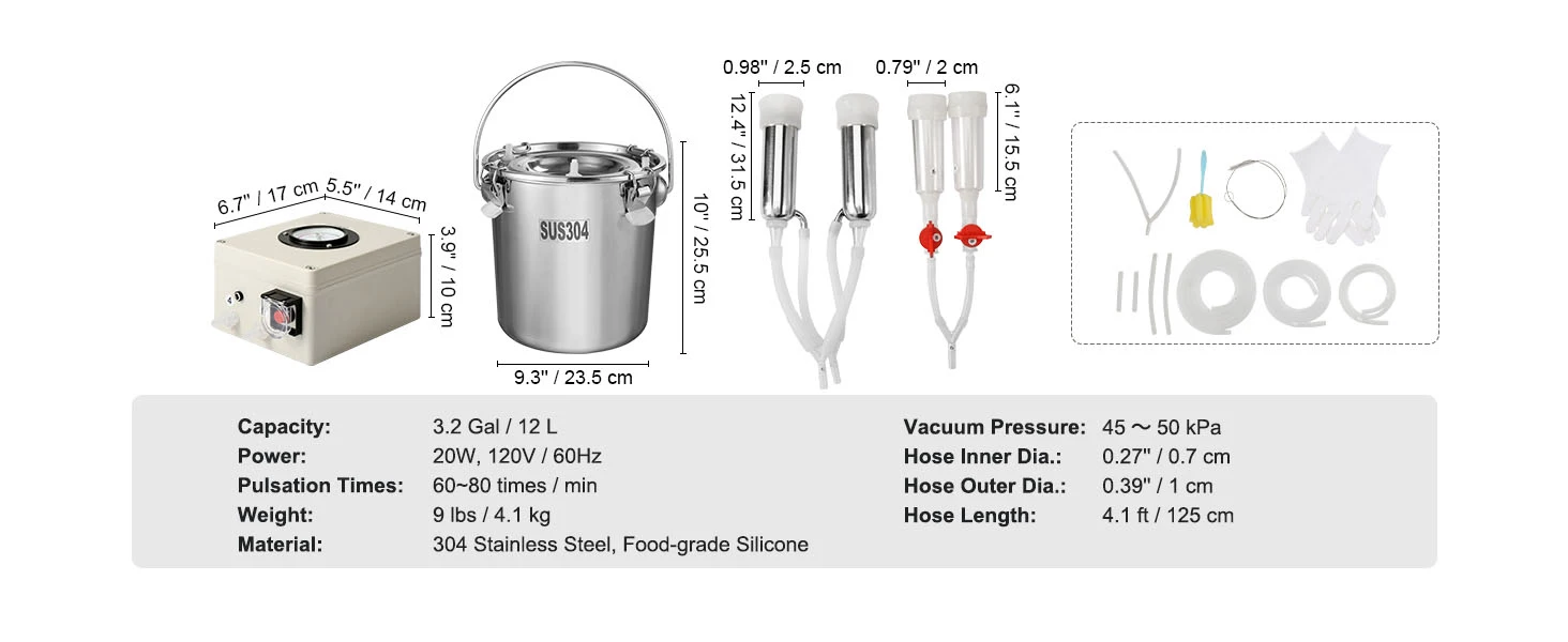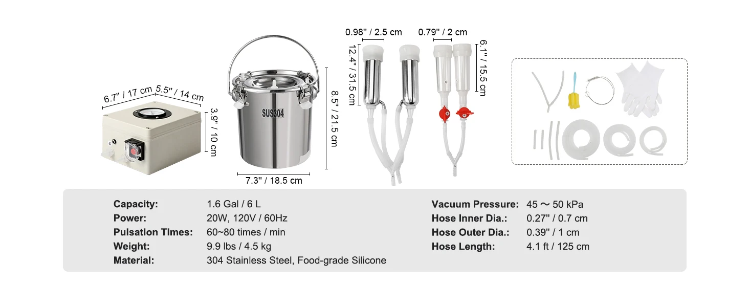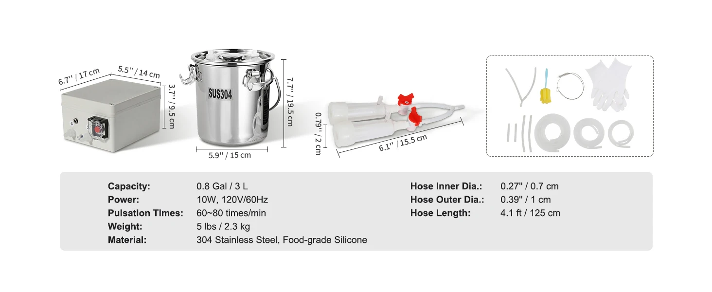 Hassle-free Clean: Install in minutes! The electric pulsation milking machine's small size makes it convenient for you to take to the farm or home breeding shed. It has an auto-stop milking device to prevent damage caused by milk overflow into the machine. Our bonus cleaning brushes make this goat milker machine easy to clean the hose and teat cup after use.
