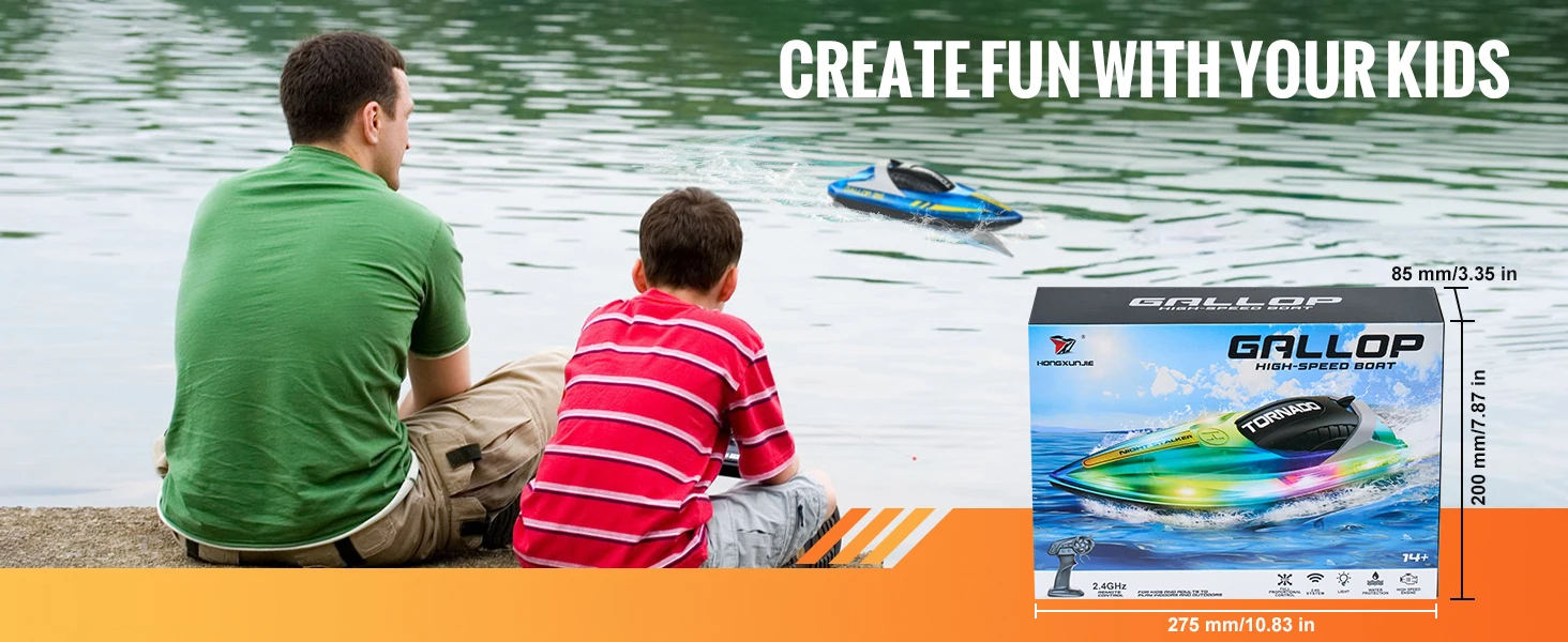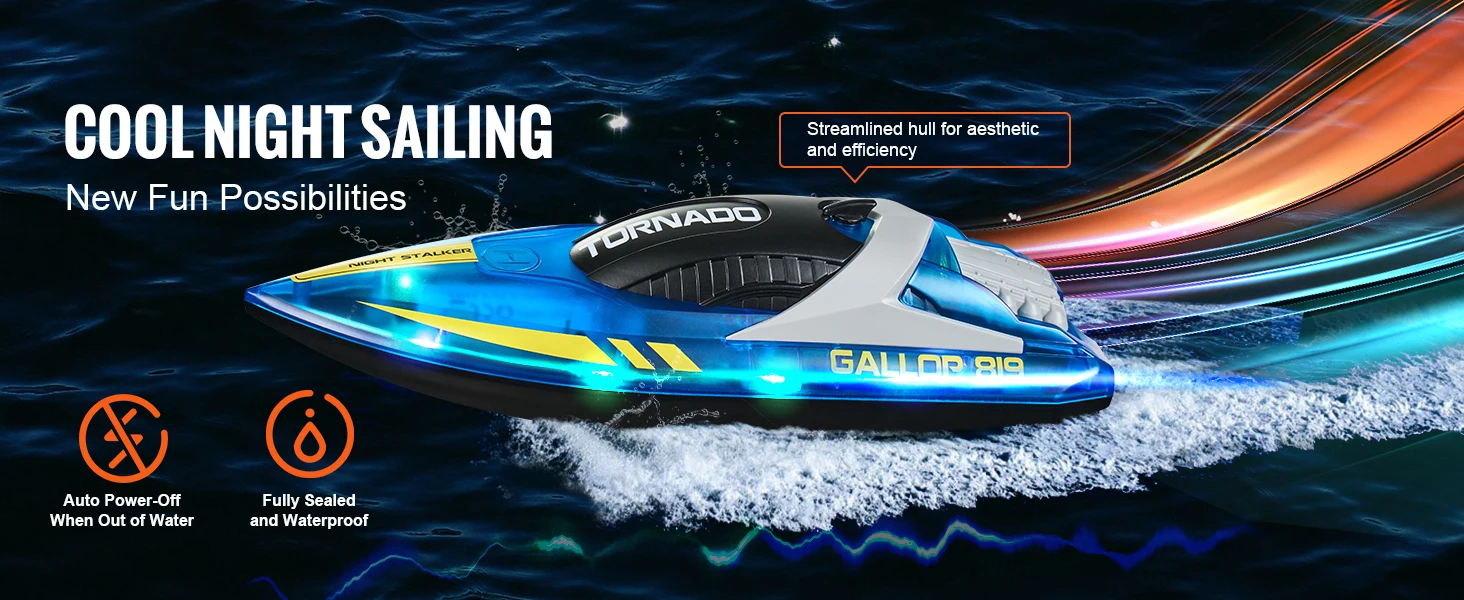 Dazzling RC Boat: Experience night-time sailing fun with this sleek, stylish remote control boat! Designed to be fully waterproof and durable, it's perfect for safe summer adventures. The special auto power-off feature when out of water keeps things safe and secure. Let your kids enjoy thrilling water play all night long!