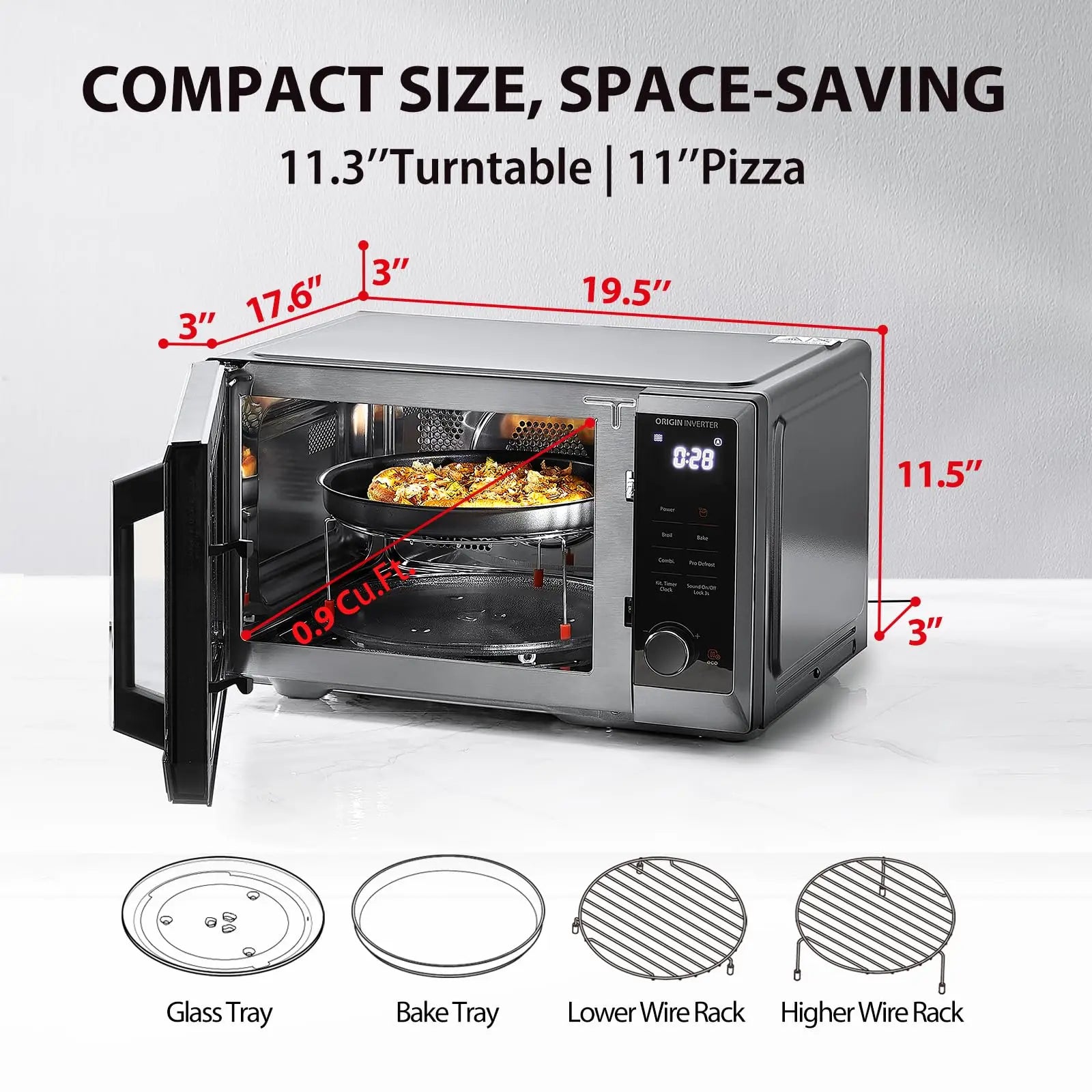 External dimensions: 19.5"W x 17.6"D x 11.5"H with 11.3" turntable. Perfect for any kitchen countertop while providing ample cooking space.