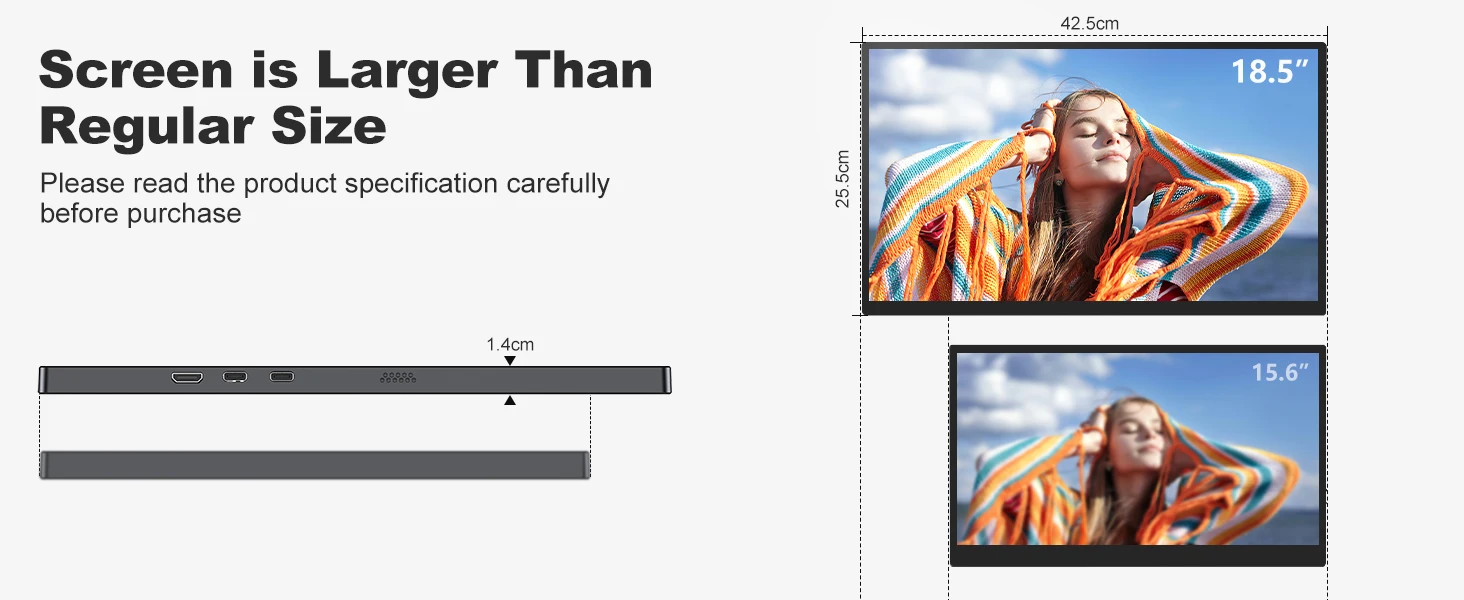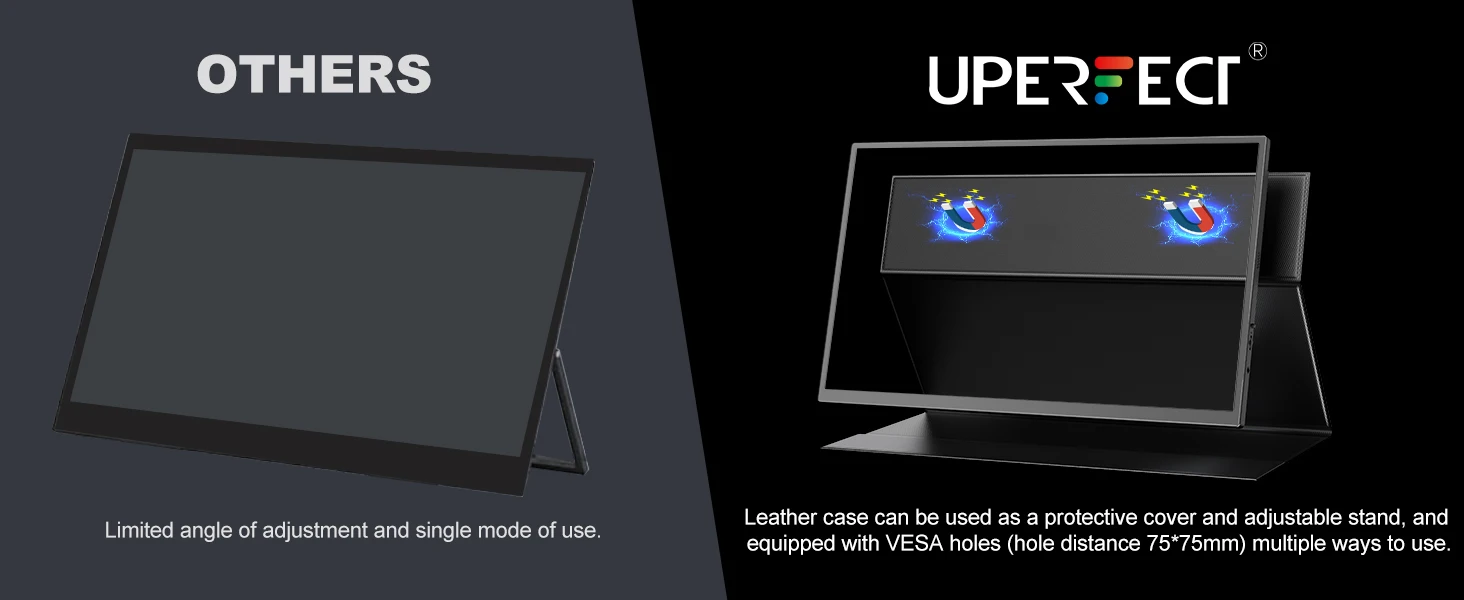 【18.5 inch BIG SCREEN】To meet your expand needs of working remotely, our engineers and producers made this 18.5 inch portable screen. Made of high classic Allumium Alloy material making UPERFECT 18.5inch monitor a durable.