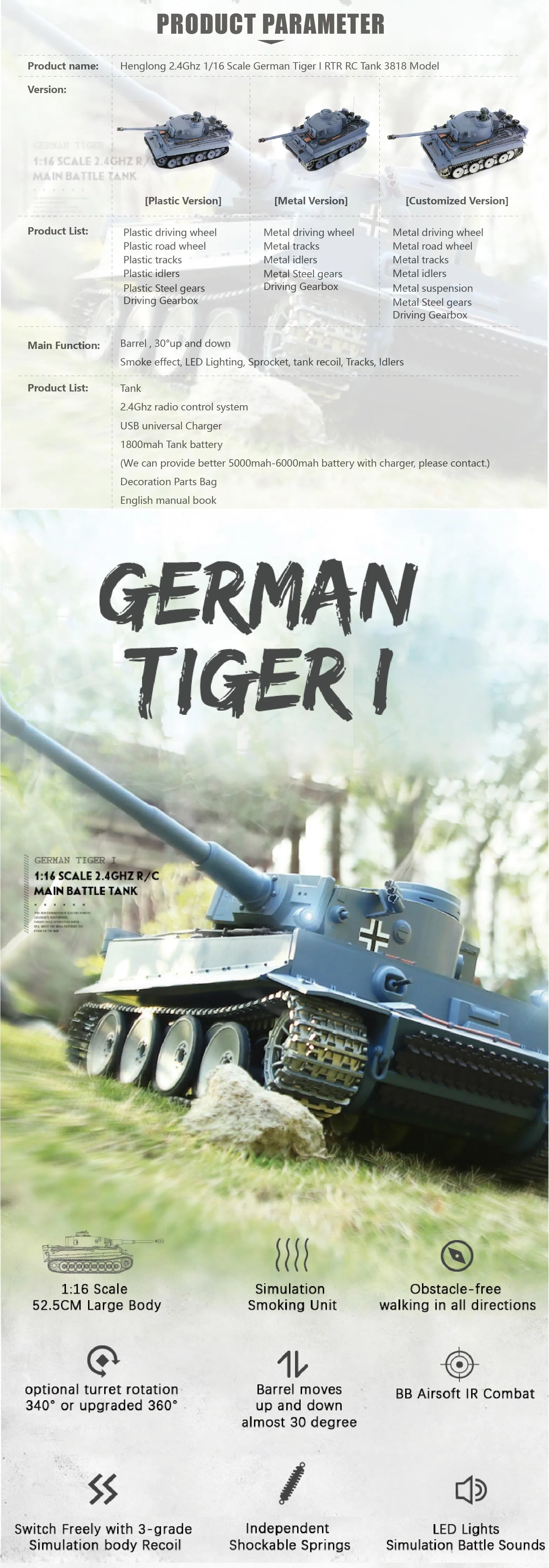 US Stock Boy Gifts 1/16 Heng Long TK7.0 German Tiger I RTR RC Tank Toy 3818 Upgraded Metal Version Model TH17239