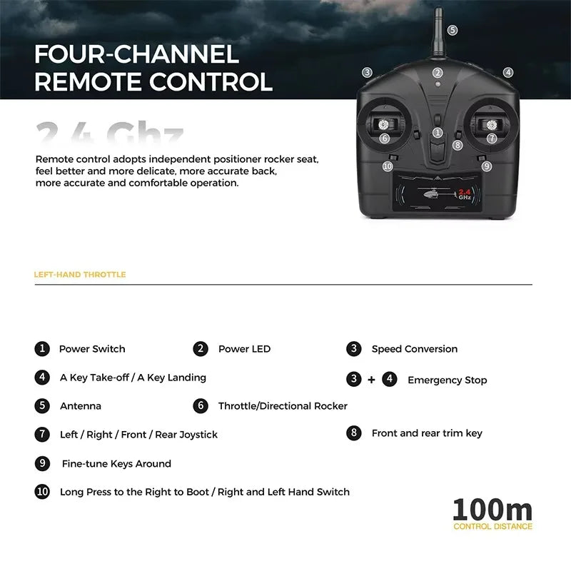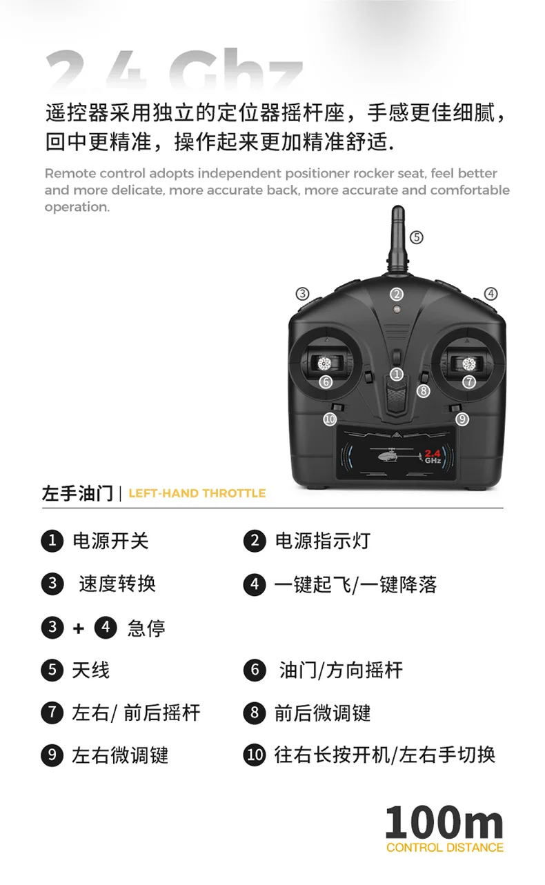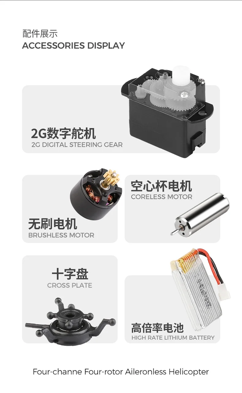 1. 4-channel remote control, free switching between left and right hands, low voltage prompt for aircraft and remote control, etc.