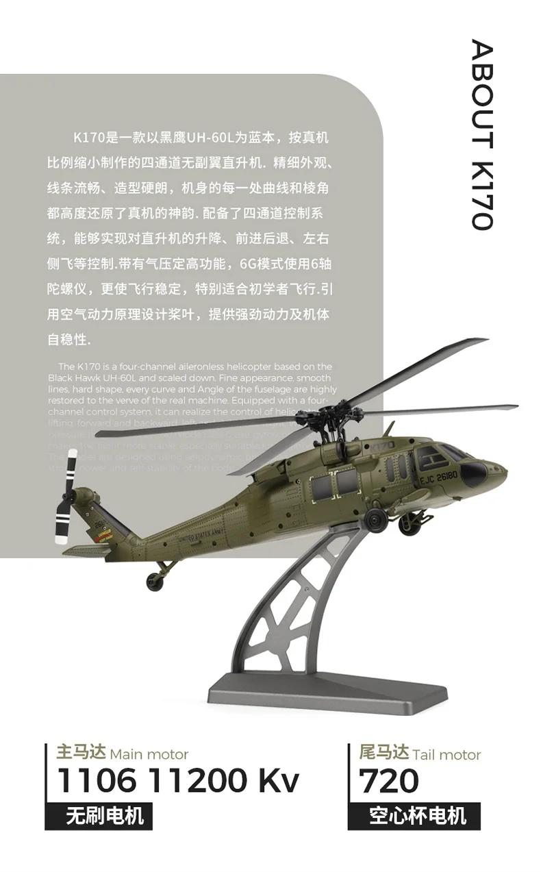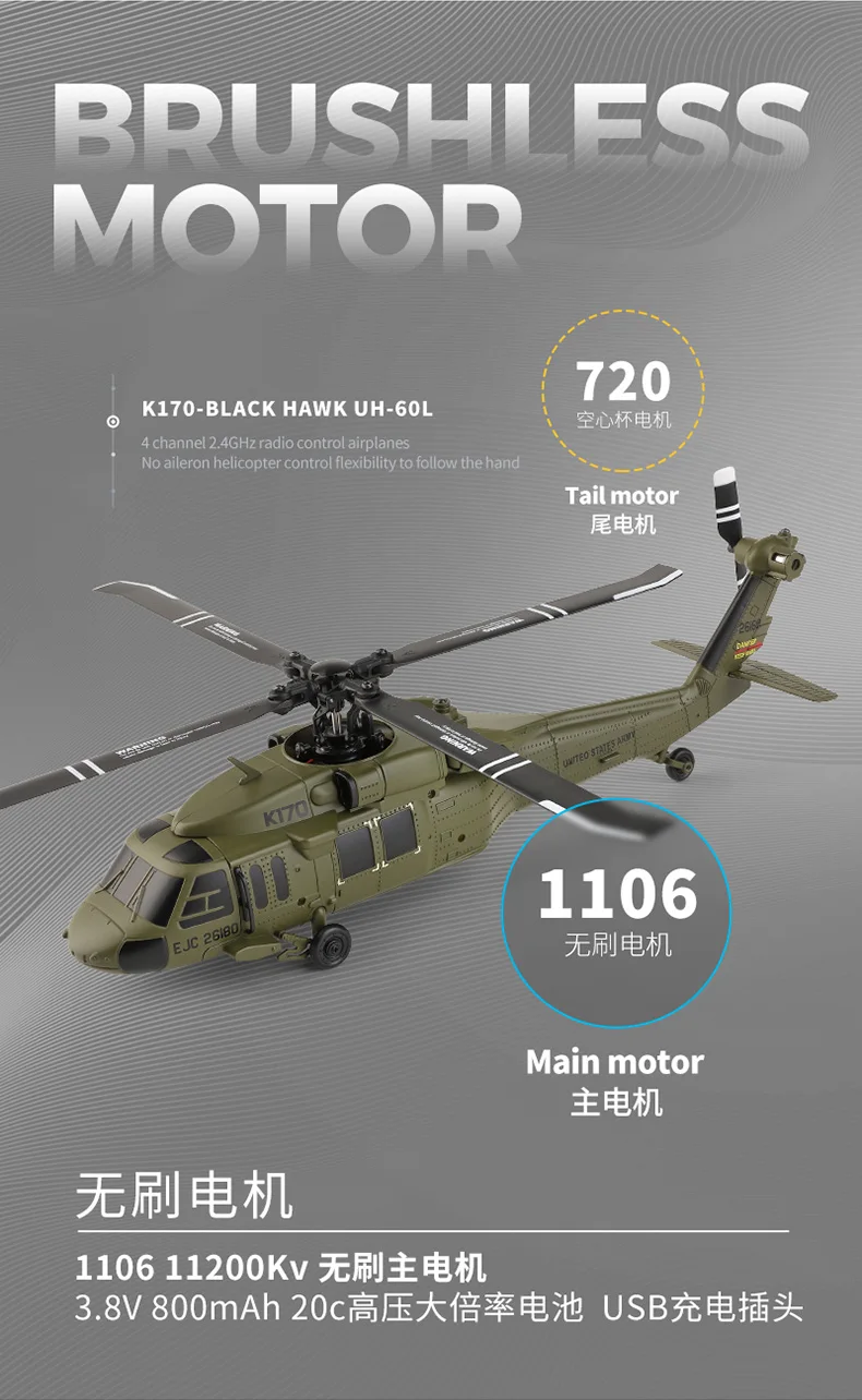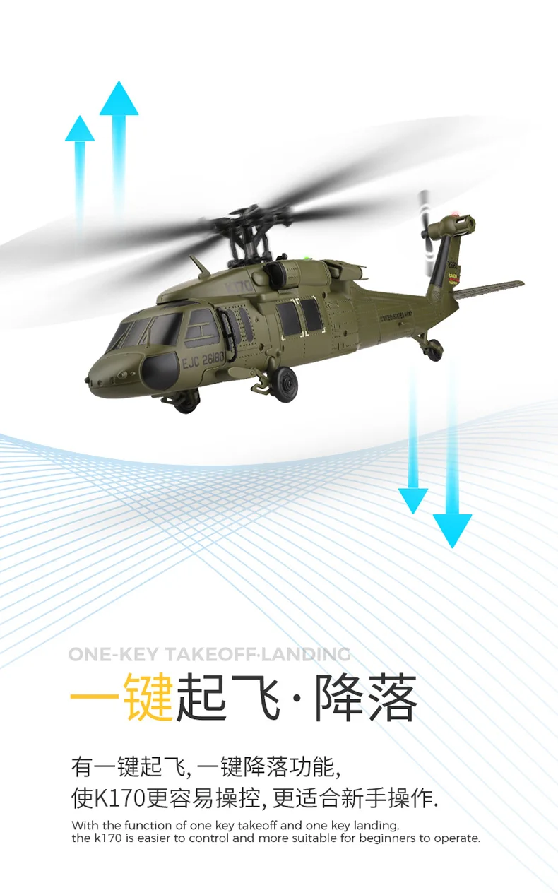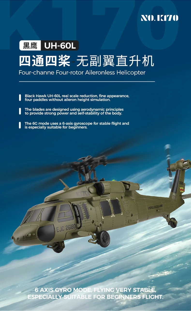 WLTOYS XK K170 UH-60L RC Helicopter is a high-precision, military-green helicopter which designed to mimic the real UH-60L , complete with a 4-channel remote and advanced features for a stable and enjoyable flight.