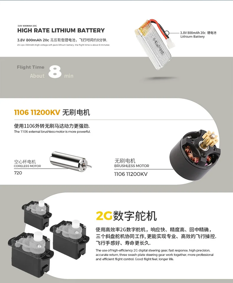 9. The 1106 external brushless motor is more powerful, and the standard 3.8V 800mAh 20c high-rate high-voltage battery has a flight time of about 8 minutes.