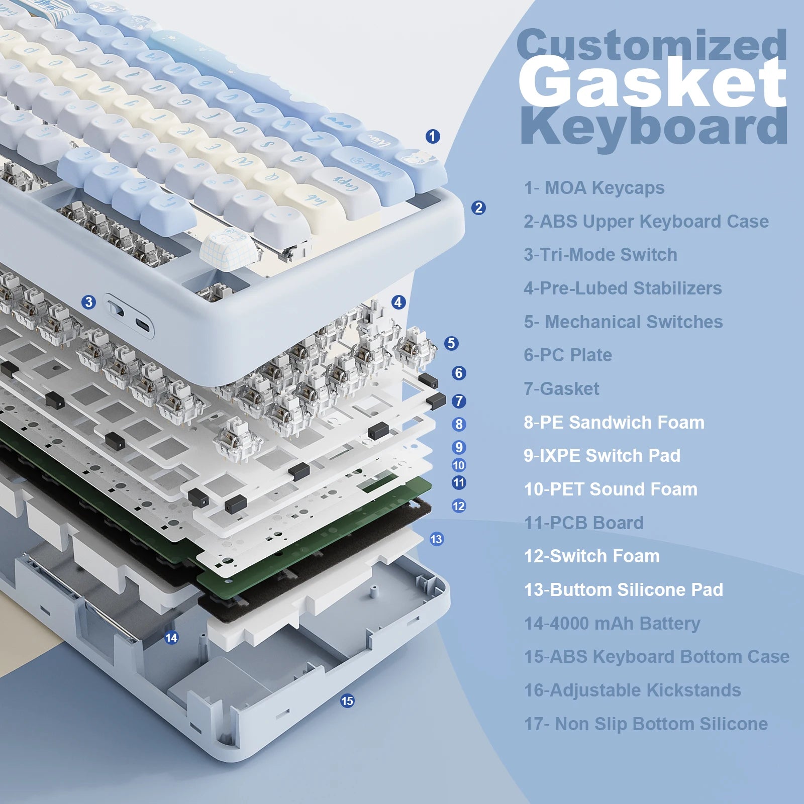 The mechanical keyboard features a gasket mount structure, filled with 5 layers of Padding, which contains PE Sandwich Foam, IXPE Switch Pad, PET Sound Foam, Switch Foam, and Silicone Bottom Pad. This construction not only reduces noise while typing but also increases the durability and stability of the gasket keyboard, giving users a comfortable and quiet typing experience.