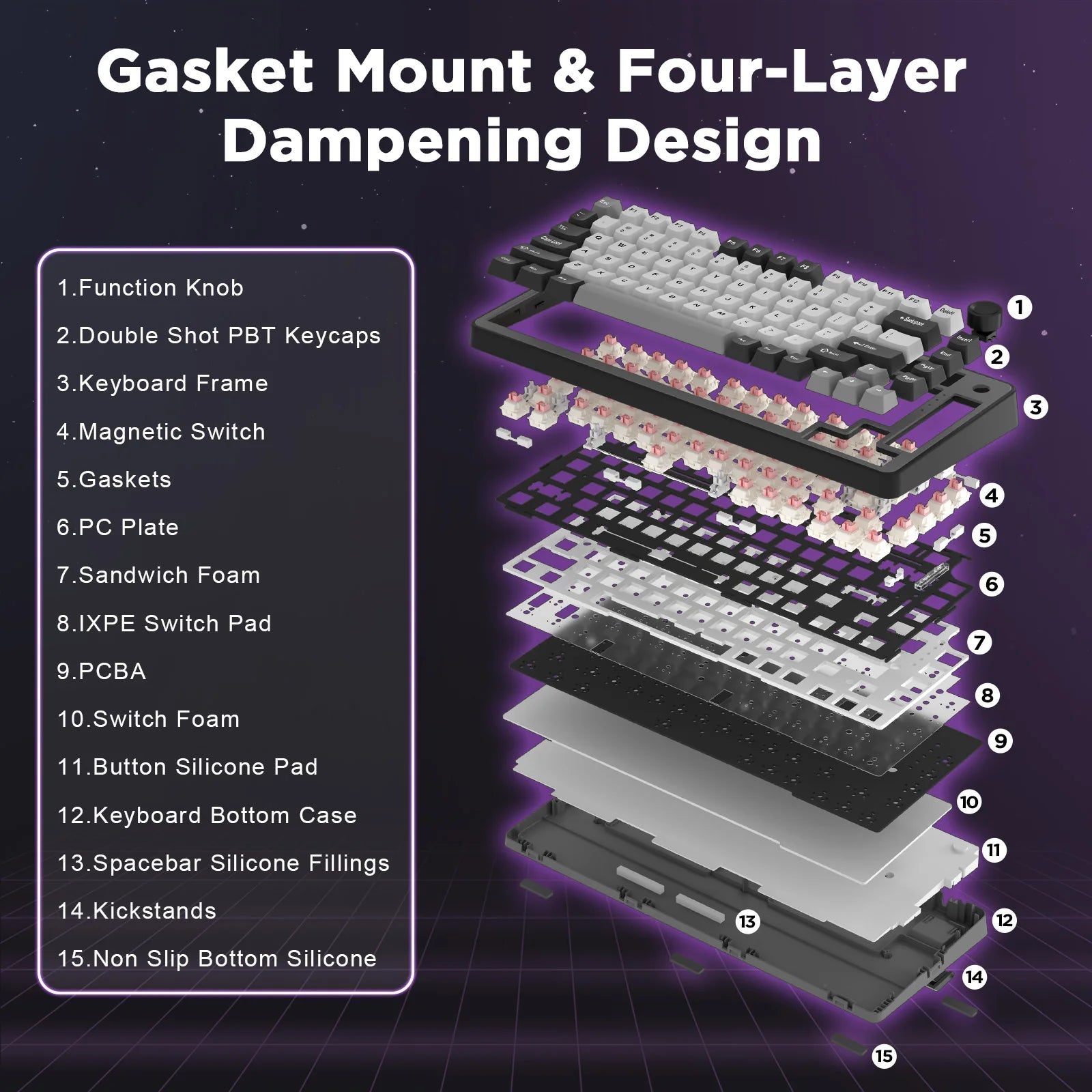 The 75% mechanical keyboard combined with features like N-key rollover and a control knob, ensures a compact yet highly functional design suitable for various applications from gaming to professional use. It features a gasket mount structure and 4-layer sound padding, reducing noise and providing a solid, creamy-sounding keyboard experience. Enjoy 16.8 million RGB backlight effects with extra shine-through transparent keycaps for WASD. South-facing LEDs ensure superior shine-through capabilities for an immersive experience.