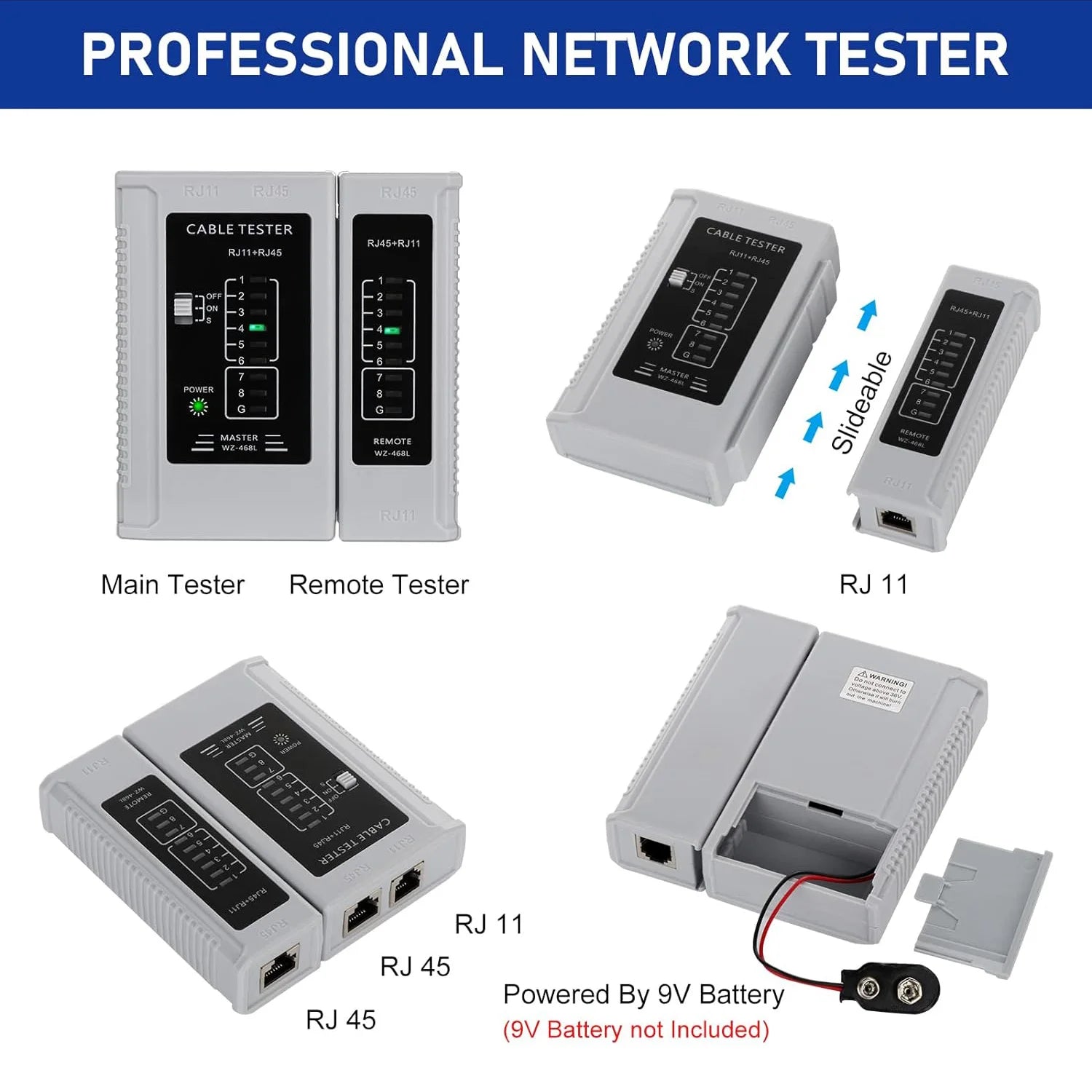 【Professional RJ45 Crimper】➤➤Ethernet crimping tool kit includes RJ45 Crimper Pass Through,20PCS CAT6 Pass-Thru Connectors, 20PCS Connector Covers, 1 x Wire Stripper and 1 x Network Cable Tester(9V Battery Not Included).